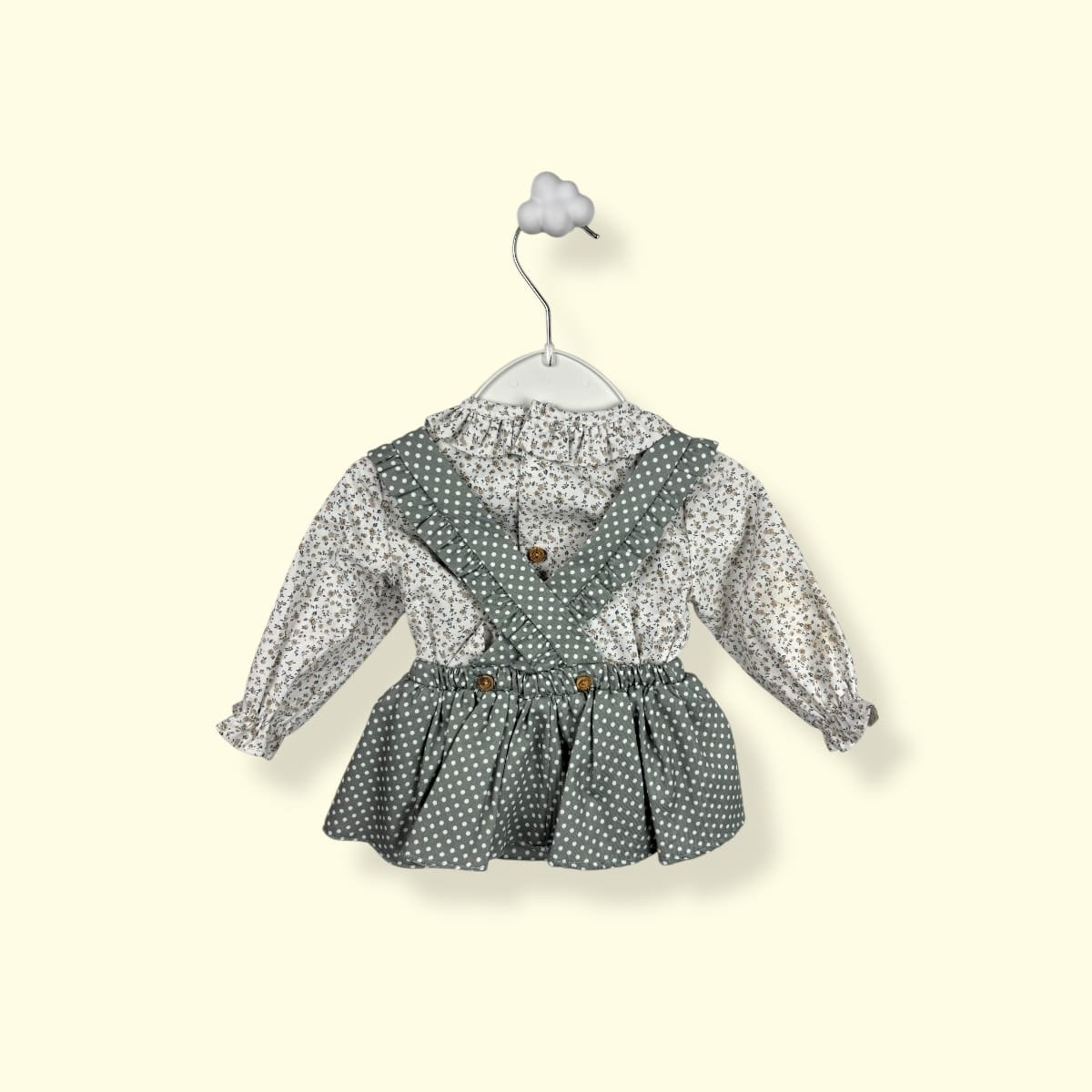 Diseñada pensando en la delicadeza de los primeros meses, esta prenda combina la practicidad de un cubrepañal con la elegancia de una faldita con vuelo.