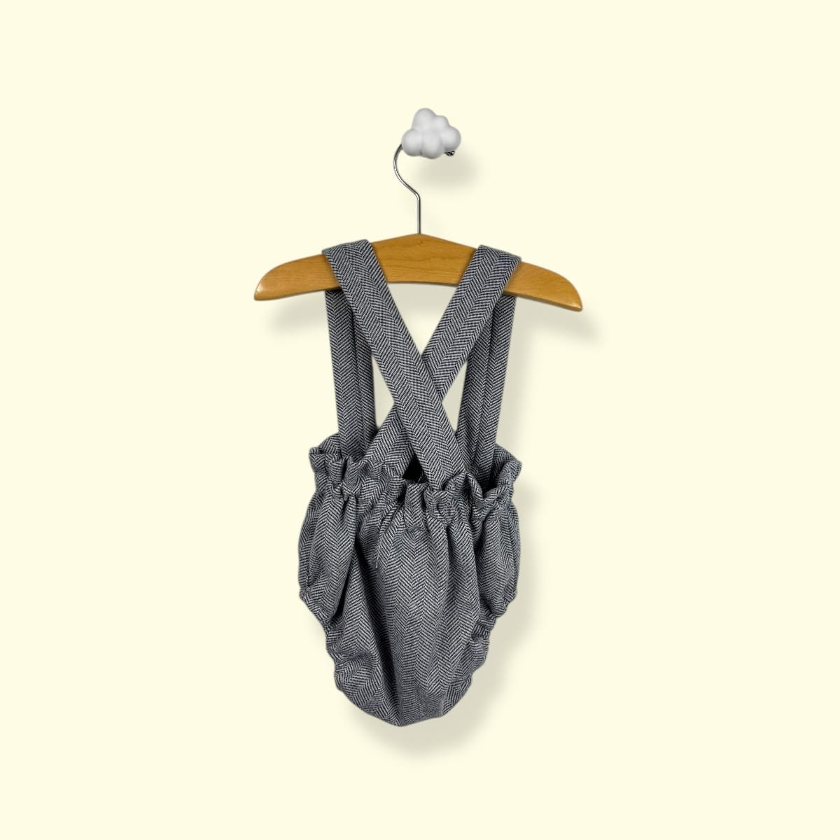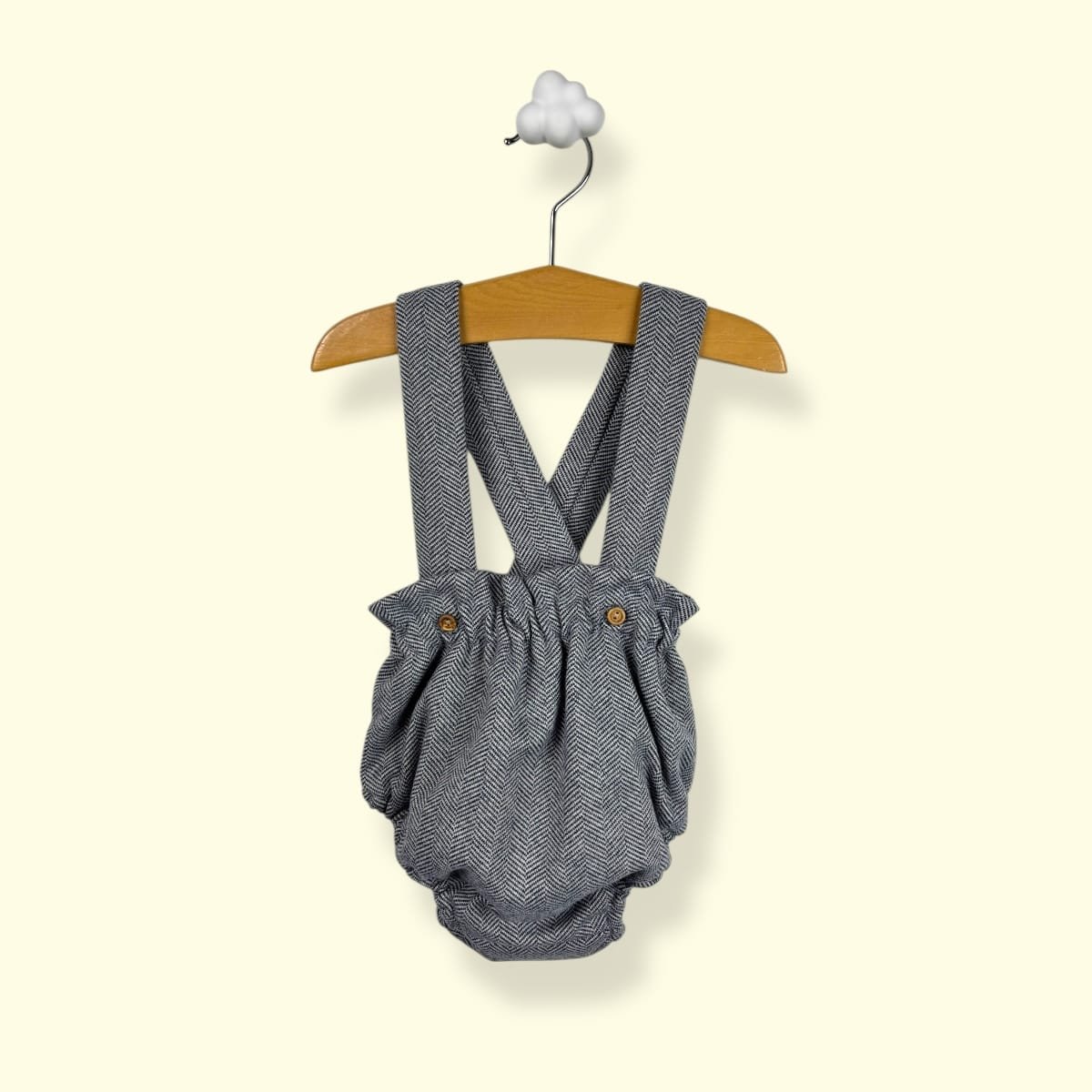 Con un diseño unisex de inspiración clásica, esta pieza destaca por la elegancia de su tejido y la comodidad de su patrón, permitiendo que el bebé se mueva con total libertad sin perder el estilo.