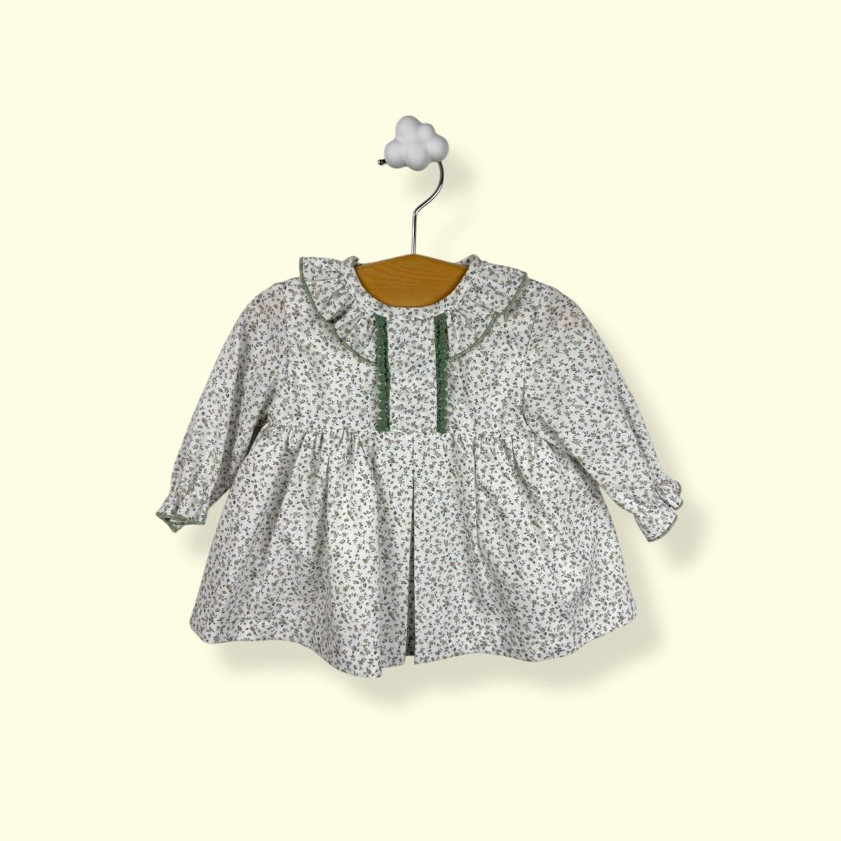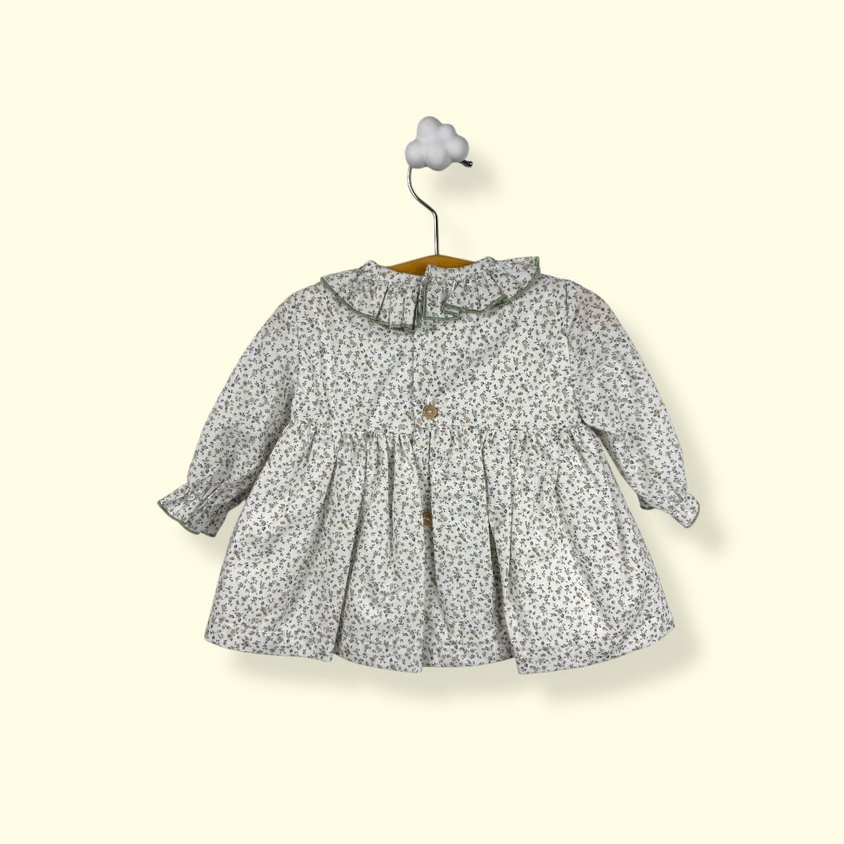 Este vestido ha sido diseñado pensando en la delicadeza de los primeros meses, combinando un tejido clásico con un patrón cómodo y favorecedor.